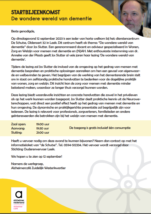 Op dinsdagavond 12 september geeft Jos Slutter een lezing over de ''De wondere wereld van dementie''. Hierin wordt praktische informatie gedeeld over het wonen, zorg en welzijn van mensen met dementie. De informatie kan handvatten bieden om de dagelijkse praktijk zo goed mogelijk in te vullen.