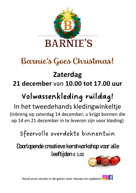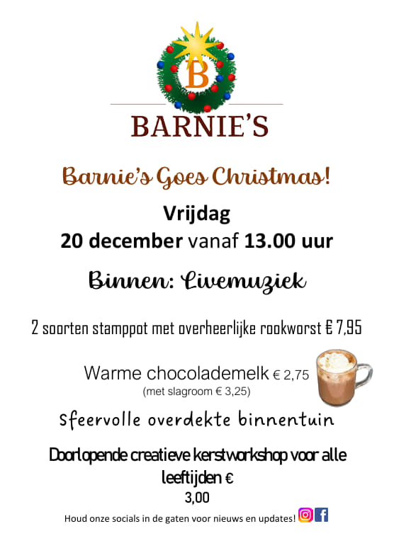 Barnie´s organiseert ook dit jaar weer allerlei leuke kerstactiviteiten. Met live muziek, leuke kerstworkshops in de binnentuin en natuurlijk heerlijke warme chocolademelk. Ook zullen er twee soorten stamppot verkrijgbaar zijn.