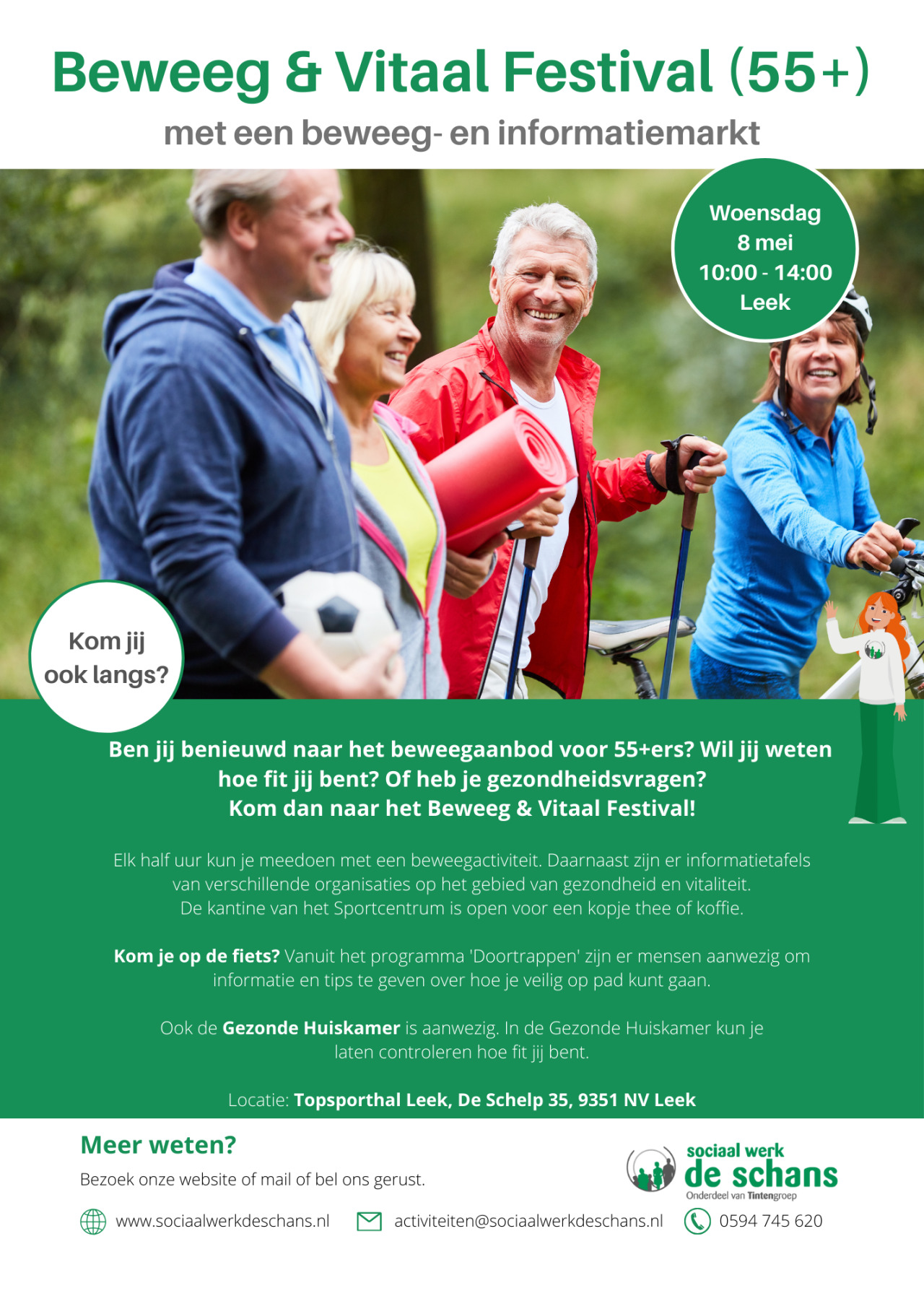 Ben jij benieuwd naar het beweegaanbod voor 55+ers?En wil jij graag weten hoe fit jij bent of heb je andere gezondheidsvragen? Kom dan naar het Beweeg & Vitaal Festival!