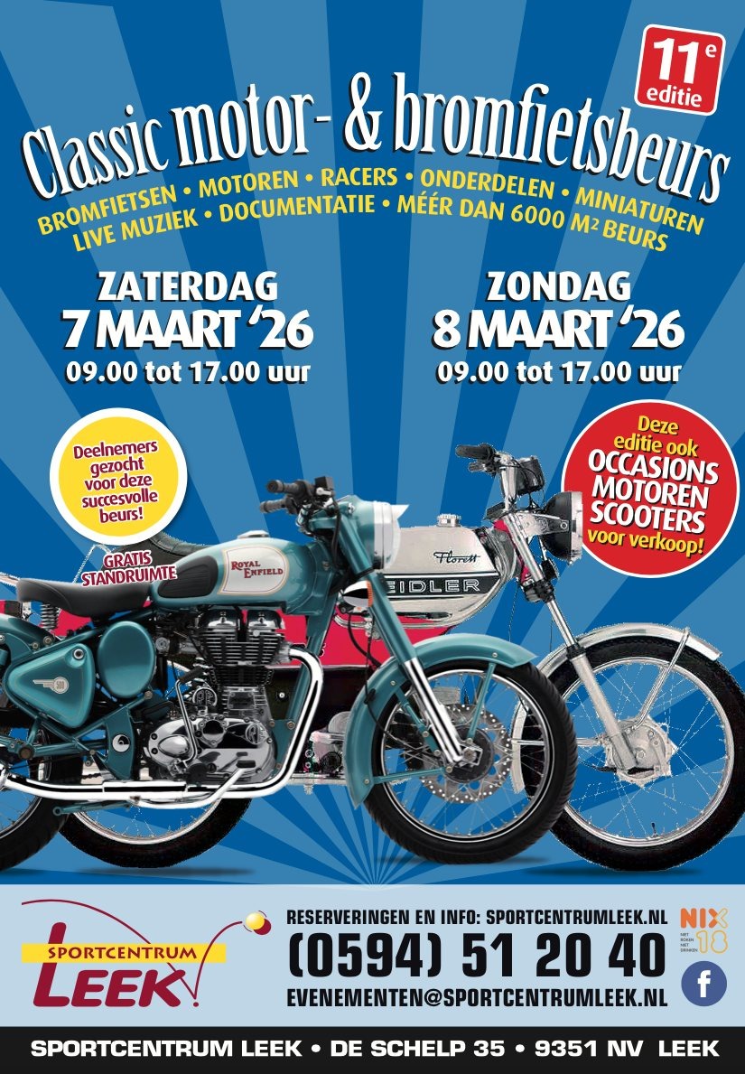 Op 7 en 8 maart is alweer de 11e editie van de Classic motor- & bromfietsbeurs in Sportcentrum Leek. In de hal staan verschillende deelnemers. Van handelaren met bromfietsen en motoren, tot miniaturen, accessoires en meer!