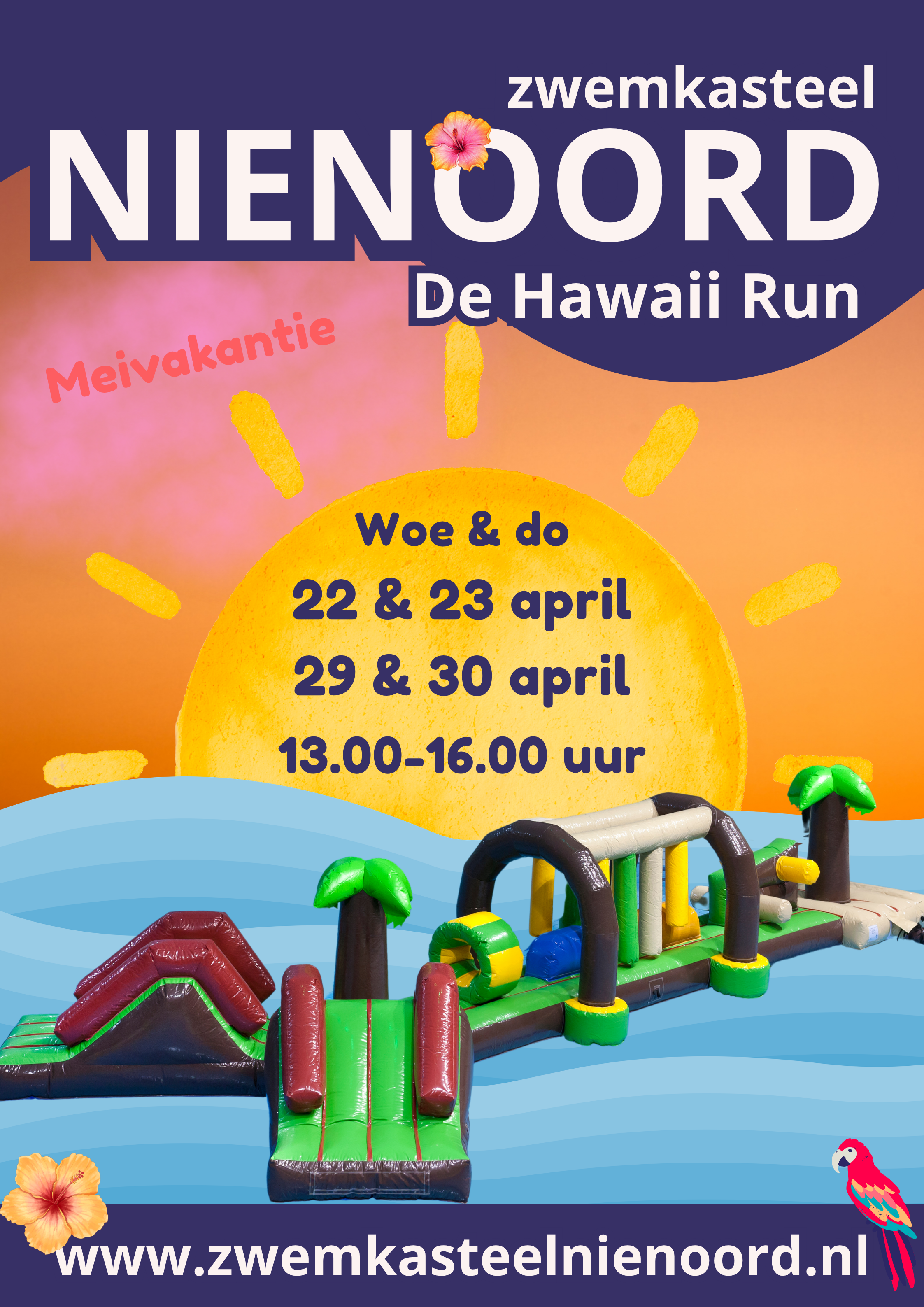 Kom spelen, springen en glijden op de Hawaii Run Stormbaan bij Zwemkasteel Nienoord in de meivakantie!