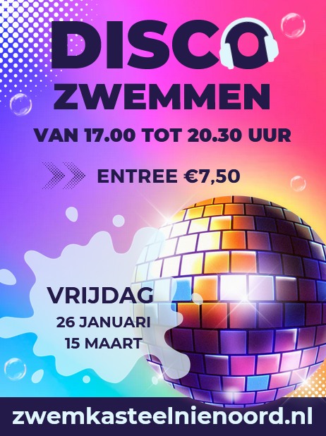 Op vrijdag 26 januari en 15 maart is het tijd voor een leuk evenement: Discozwemmen in Zwemkasteel Nienoord! Bereid je voor op een avond vol ritmische deuntjes, kleurrijke lichten en heel veel plezier!