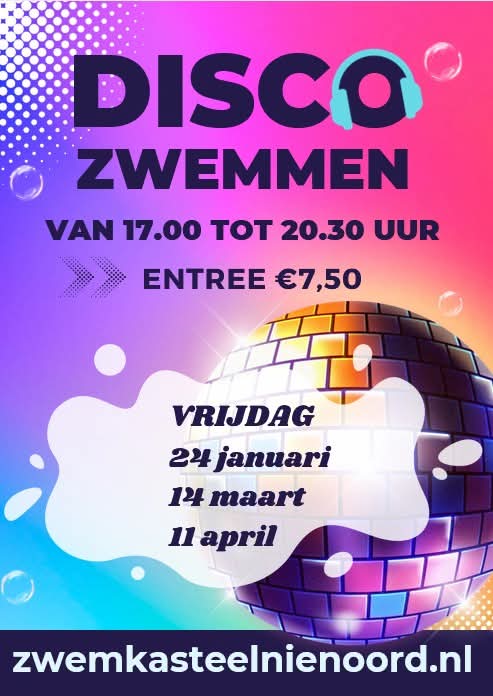 Het is tijd voor disco! Heb je zin in een spetterend feest? Kom dan discozwemmen bij Zwemkasteel Nienoord. Dans en zwem mee op de leukste hits onder water.