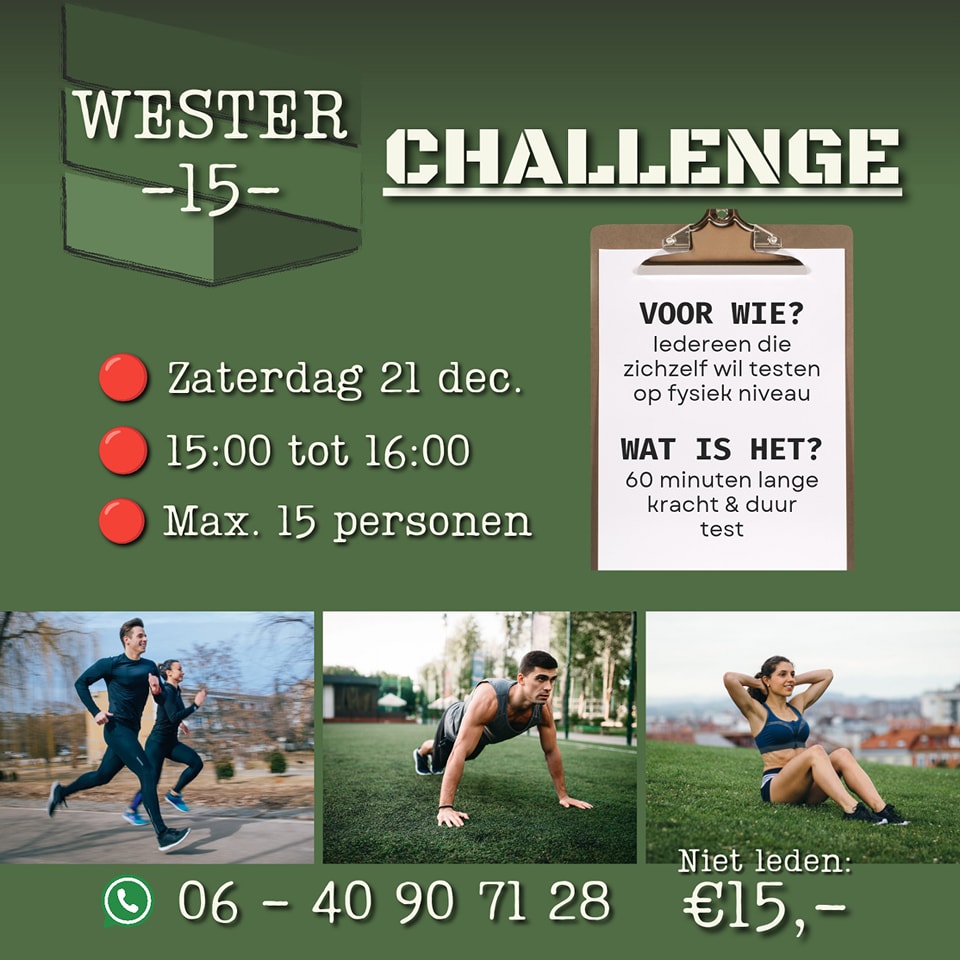 Ben jij klaar om je grenzen te verleggen? Op zaterdag 21 december van 15:00 tot 16:00 uur vindt de Wester-15 Challenge plaats, een unieke kracht- en uithoudingsvermogen-uitdaging geïnspireerd op de trainingen van het Korps Commandotroepen en Special Forces. Deze ultieme test, bedacht door Raymond van de Ven en Roald Arts, laat je ervaren wat het betekent om écht tot het uiterste te gaan.