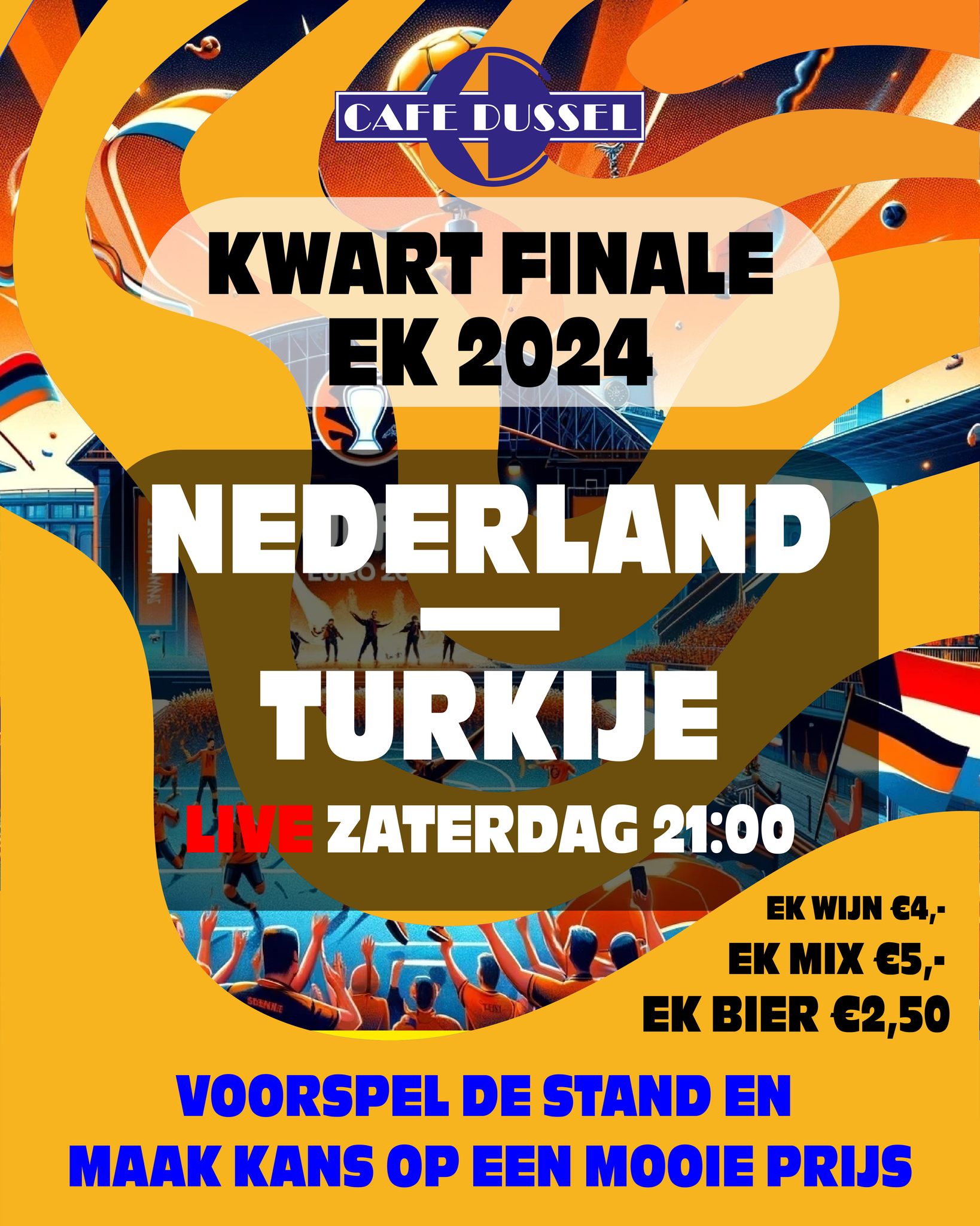 Het Nederlands elftal heeft zich geplaatst voor de kwartfinale van het EK en speelt aanstaande zaterdag tegen Turkije. Deze belangrijke wedstrijd, die zal bepalen of Nederland doorgaat naar de halve finale, vindt plaats op zaterdagavond 6 juli om 21.00 uur. Voor iedereen die de wedstrijd in een gezellige en sfeervolle omgeving wil beleven, biedt Café Dussel de perfecte locatie. Het café zendt de wedstrijd live uit, en het belooft een gezellig oranje feest te worden. Kom naar Café Dussel om samen met andere fans te genieten van deze spannende avond en het Nederlands elftal aan te moedigen. Foto: Cafe Dussel