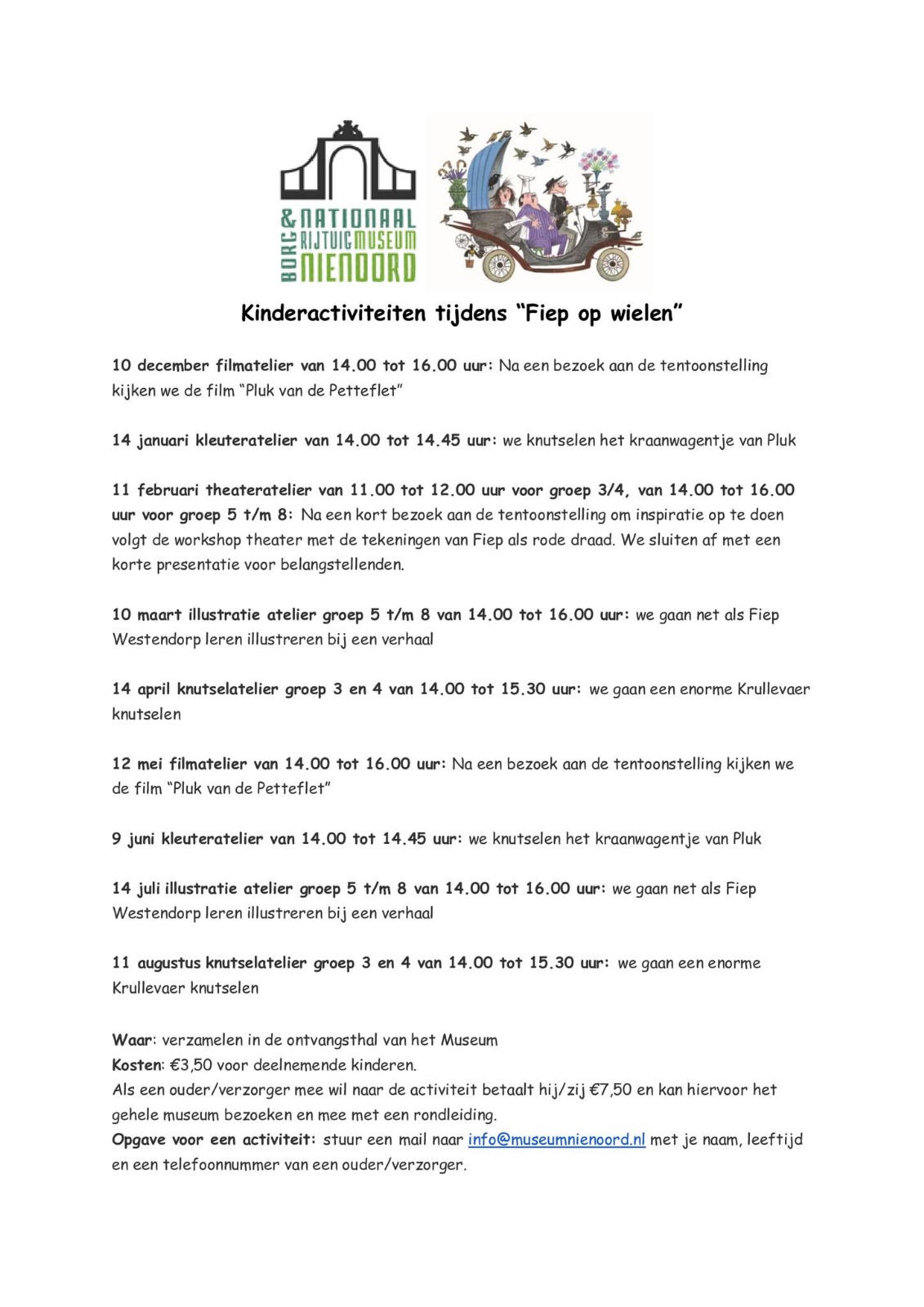 Museum Nienoord nodigt de jongste ontdekkingsreizigers uit voor een opwindend avontuur in de wereld van tekenaar Fiep Westendorp met de tentoonstelling "Fiep op Wielen". Deze speciale expositie werpt een speelse blik op alle voertuigen die de creatieve geest van Fiep tot leven heeft gebracht. Om het feest compleet te maken, introduceert het museum allerlei leuke activiteiten voor kinderen, om op een andere wijze kennis te maken met de werken. Zo word er een film, knusel, illustratie en knutselatelier georganiseerd. Zo kunnen de kinderen op de manier die hun het meeste aanpreekt de kunst van Fiep Westerdorp ontdekken. Kinderactiviteiten tijdens “Fiep op wielen” bij Museum Nienoord Voor in je agenda: 10 december Filmatelier van 14.00 tot 16.00 uur: Na een bezoek aan de tentoonstelling kijken we de film “Pluk van de Petteflet”. 14 januari Kleuteratelier van 14.00 tot 14.45 uur: we knutselen het kraanwagentje van Pluk. 11 februari Theateratelier van 11.00 tot 12.00 uur voor groep 3/4, van 14.00 tot 16.00 uur voor groep 5 t/m 8: Na een kort bezoek aan de tentoonstelling om inspiratie op te doen volgt de workshop theater met de tekeningen van Fiep als rode draad. We sluiten af met een korte presentatie voor belangstellenden. 10 maart Illustratie atelier groep 5 t/m 8 van 14.00 tot 16.00 uur: we gaan net als Fiep Westendorp leren illustreren bij een verhaal. 14 april Knutselatelier groep 3 en 4 van 14.00 tot 15.30 uur: we gaan een enorme Krullevaer knutselen 12 mei Filmatelier van 14.00 tot 16.00 uur: Na een bezoek aan de tentoonstelling kijken we de film “Pluk van de Petteflet” 9 juni Kleuteratelier van 14.00 tot 14.45 uur: we knutselen het kraanwagentje van Pluk 14 juli Illustratie atelier groep 5 t/m 8 van 14.00 tot 16.00 uur: we gaan net als Fiep Westendorp leren illustreren bij een verhaal 11 augustus Knutselatelier groep 3 en 4 van 14.00 tot 15.30 uur: we gaan een enorme Krullevaer knutselen.