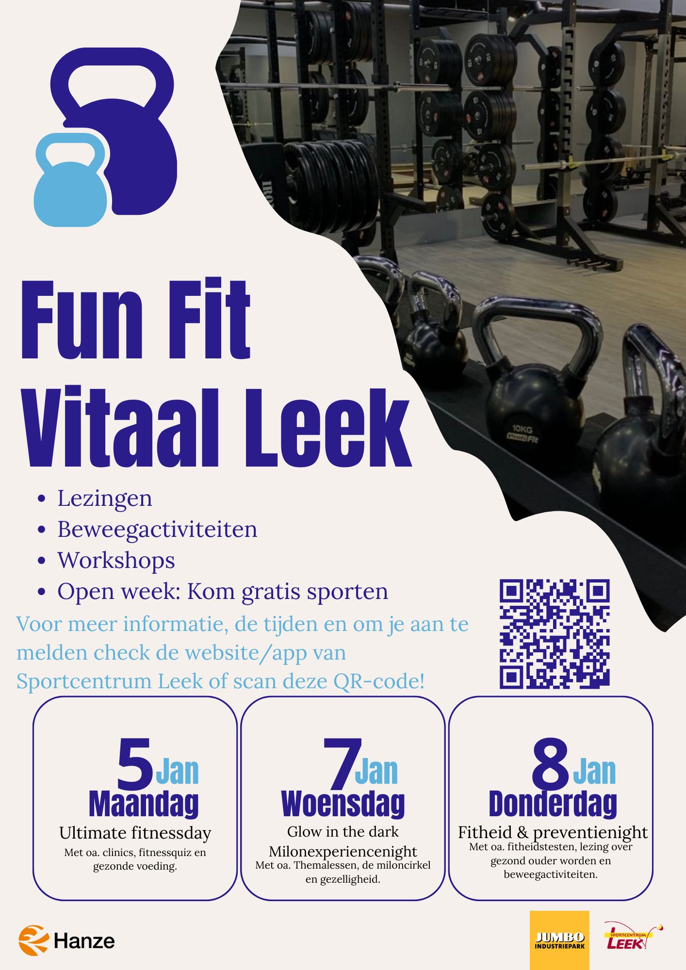 Studenten van de opleiding Sportkunde aan de Hanzehogeschool in Groningen, organiseren op 5,7 en 8 januari 2026 ''Fun Fit Vitaal Leek'' bij Sportcentrum Leek.