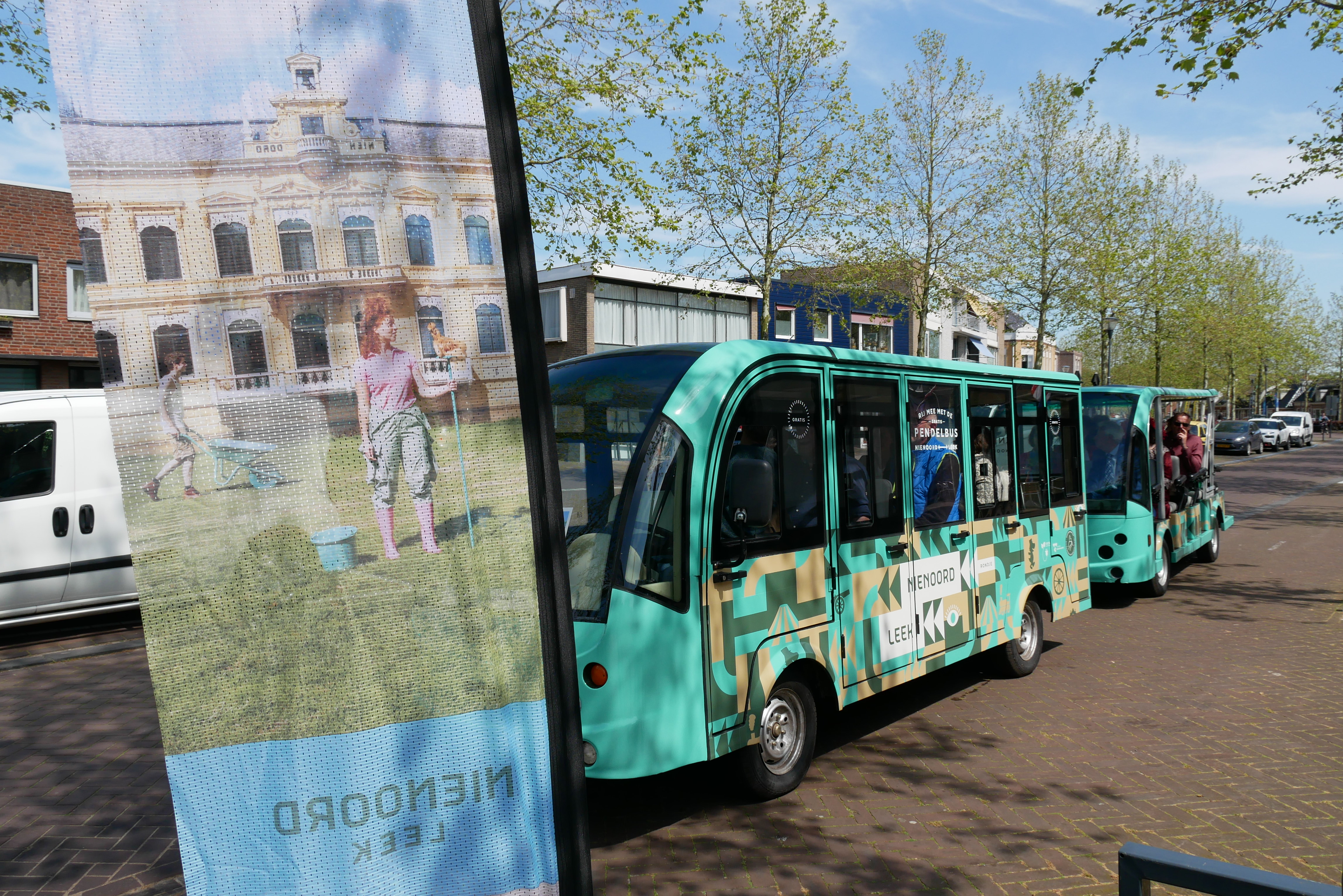 De pendelbus vertrekt ieder heel uur vanaf het Infocentrum Nienoord om de lange route in circa 40 minuten (kleur groen op de kaart) te rijden over het Landgoed Nienoord en een deel van het centrum van Leek.