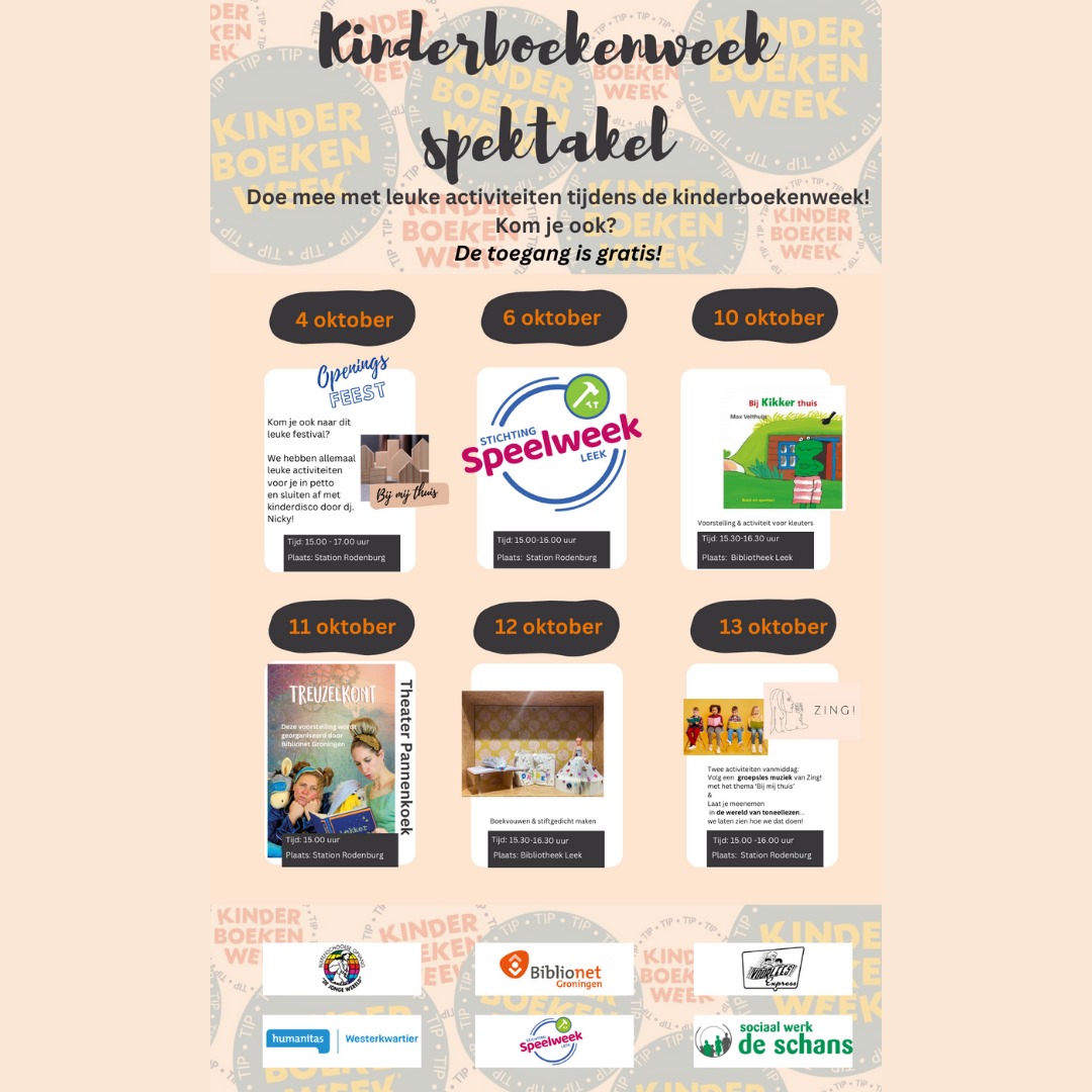 Ieder jaar is de kinderboekenweek een groot succes! Op een leuke manier leren kinderen meer over lezen en boeken. Leek haakt in op deze week, door allerlei leuke en gratis activiteiten te organiseren. Van 4 tot en met 13 oktober kunnen de kinderen bij de bibliotheek Leek en Station Rodenburg genieten van allerlei soorten vermaak. Het gaat zeker niet alleen over lezen, maar ook knutselen en muziek spelen een grote rol. Maak kennis met het thema bij mij thuis en ontdek de leukste boeken en verhalen!