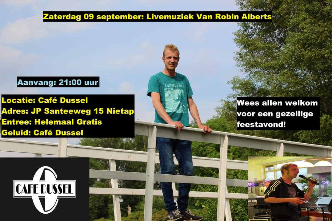 Zaterdag 9 september zorgt zanger Robin Alberts voor een gezellige feestavond bij Café Dussel. Met live muziek wordt er een toffe sfeer gecreëerd, die de stemming alleen maar ten goede komt.