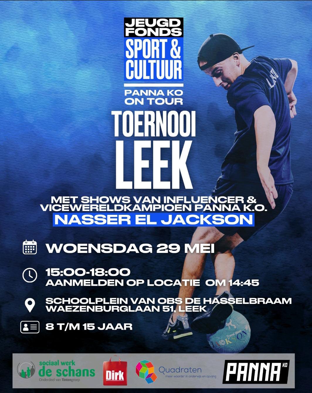 Laat je eigen trucjes zien en laat je inspireren door Nasser el Jackson, het kan tijdens het Panna knock-out toernooi in Leek! Iedereen van 8 tot 15 jaar is welkom op woensdag 29 mei om zijn of haar skills te laten zien. Aanmelden kan ter plekke, op het schoolplein van OBS de Hasselbraam.