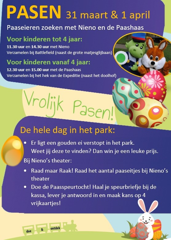 Vier Pasen in het gezellige familiepark Nienoord. Kom eieren zoeken met Nieno en de Paashaas, ook kun je een leuke speurtocht doen, speuren naar het gouden ei en misschien raad je wel hoeveel paaseitjes bij Nieno's theater zijn. Al deze activiteiten zijn bij je abbonnement inbegrepen.