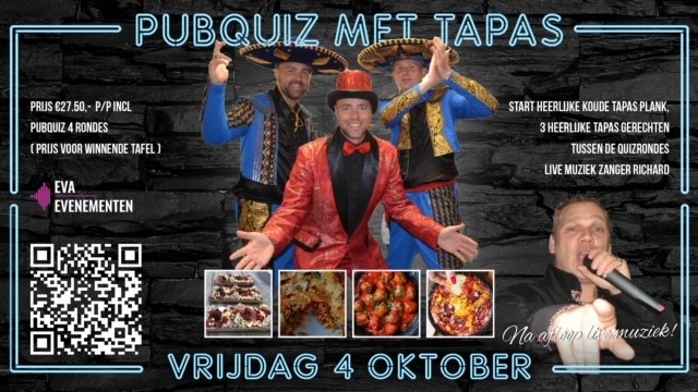 Maak jij graag veel lol? Koop snel je ticket; want vol=vol! €27,50,- P/P inclusief 4 rondes pubquiz, een prijs voor de winnende tafel. We starten met heerlijke koude tapas plank en tussen de quizzen door 3 warme tapas hapjes!