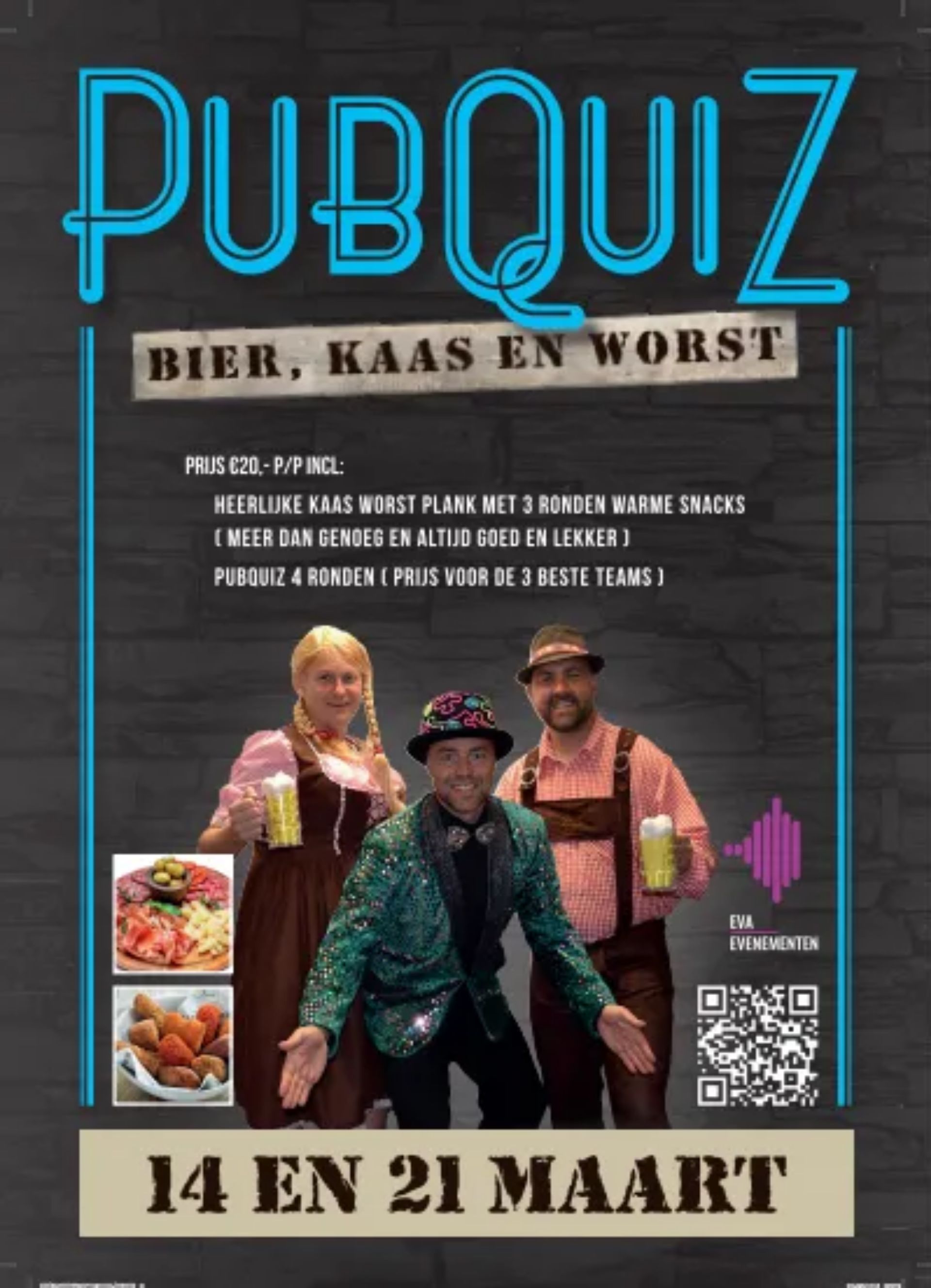 Op 21 maart organiseert EVA Evenementen een quiz bestaande uit vier rondes. De avond begint met een kaas- en worstplank en tussen de quizrondes door worden ook warme snacks geserveerd.