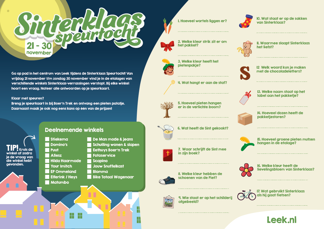 Kinderen kunnen hun antwoorden invullen op de speurkaarten, die verkrijgbaar zijn bij de deelnemende winkels. Na afloop kunnen ze hun ingevulde kaart inleveren bij Eethuys Boer'n trek voor een pietenpatatje en maken ze kans op leuke prijzen die beschikbaar zijn gesteld door de ondernemers uit het centrum van Leek.