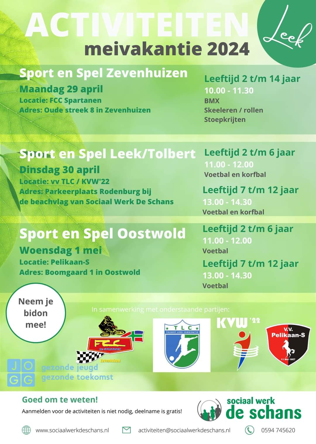 In de vakantie hoeven de kinderen niet stil te zitten. Ze kunnen namen gezellig komen korfballen en voetballen. Sociaal werk de Schans organiseert op verschillende plekken in de buurt allemaal sportieve activiteiten. Er zijn twee leeftijdsgroepen: