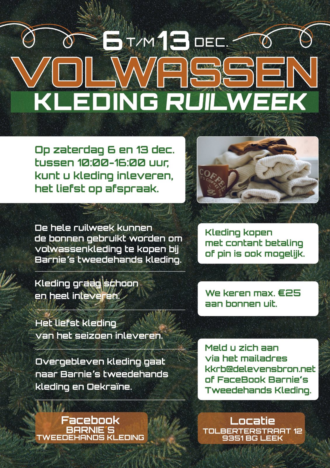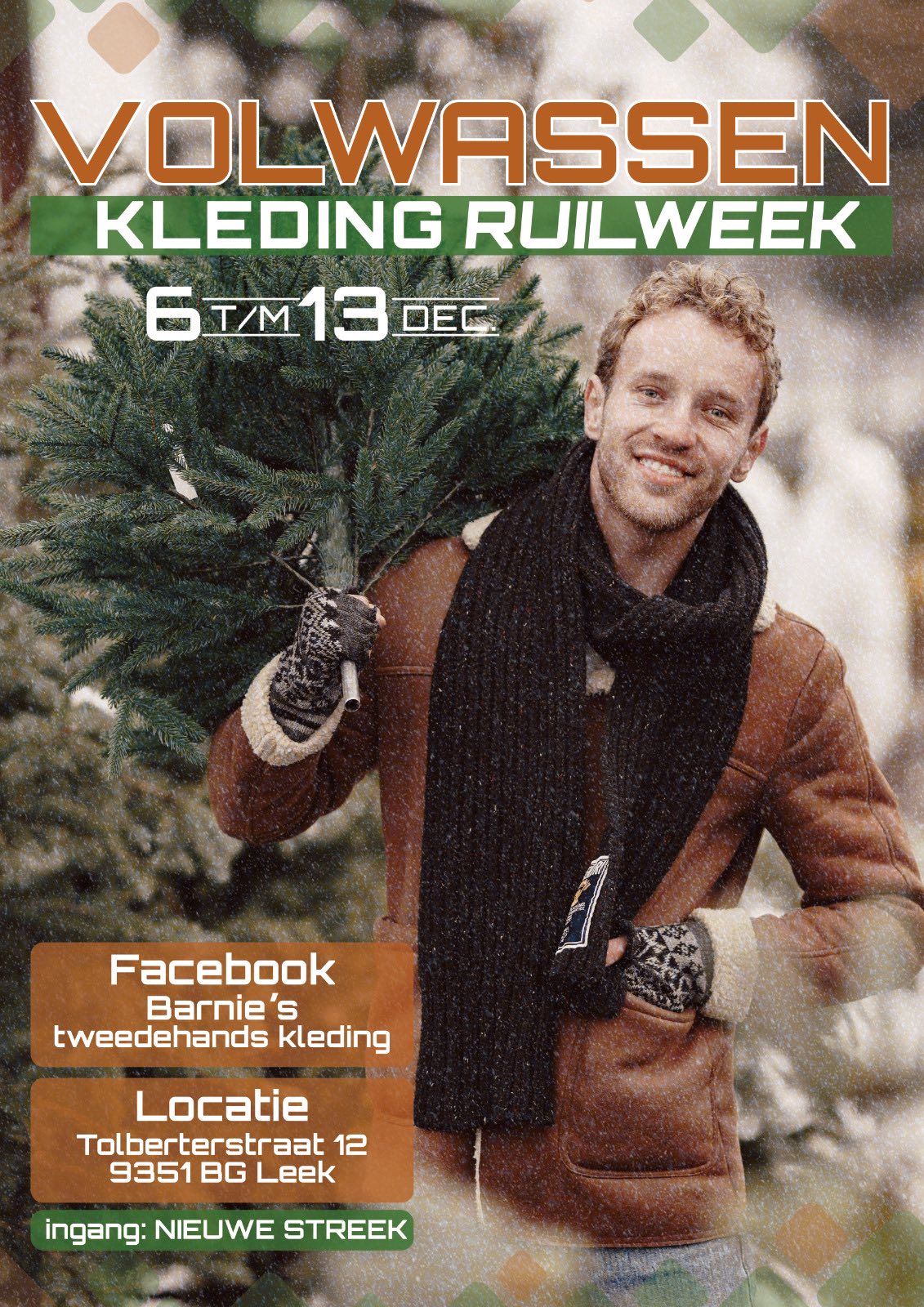 Van 6 t/m 13 december is het volwassenkledingruilweek bij Barnie's. De hele week kan je jouw kleding tussen 10:00 en 16:00 inleveren. Bij inruil krijg je een waardebon die de hele week kan worden gebruikt om volwassen kleding mee te kopen bij Barnie's tweedehandswinkel.