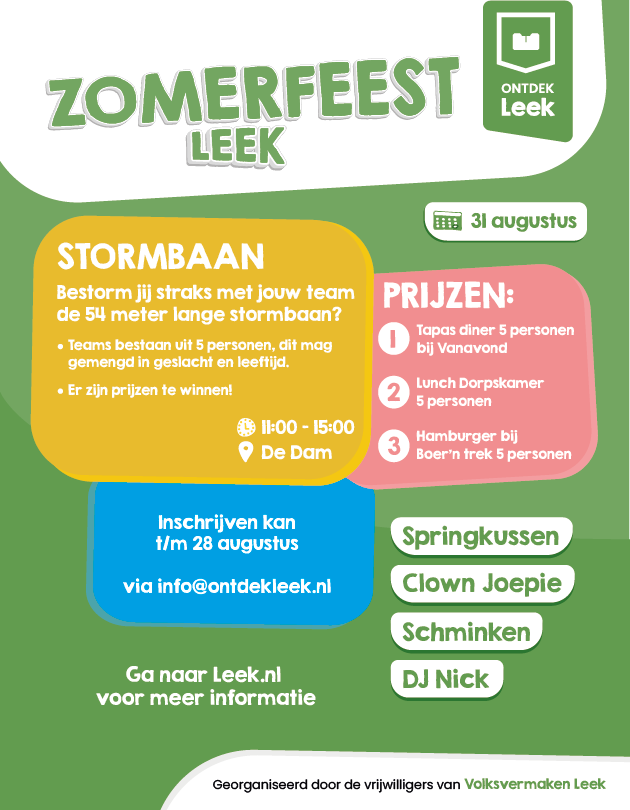 Vanaf 11:00 uur begint het avontuur met een uitdagende stormbaan van 54 meter op De Dam. Teams van 5 personen zullen het opnemen tegen hindernissen zoals een klimbweb, kruiptunnels en nog veel meer. De top drie teams krijgen mooie prijzen en trofeeën! Je kunt je team nog inschrijven tot 28 augustus via info@ontdekleek.nl, en deelname is helemaal gratis.