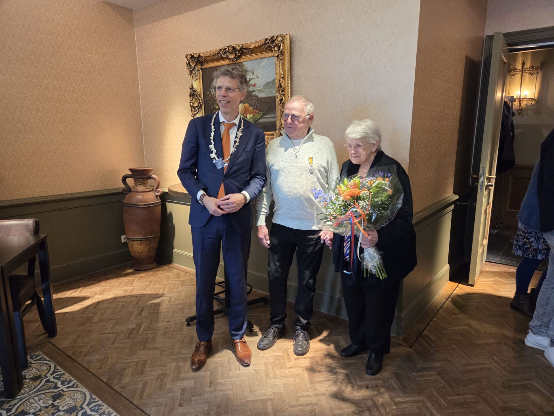 Het leek een gewone dag te worden voor Douwe Veenstra. Hij werd de hele dag door Pieter Wouda meegenomen in de Daf, nietsvermoedend. Totdat hij in De Postwagen aankwam en plotseling werd verrast door een groep dierbaren die op hem stond te wachten. En niet zomaar: ook burgemeester Ad van der Tuuk was daar. Met een hele bijzondere reden, want Douwe kreeg vandaag een Koninklijke Onderscheiding.