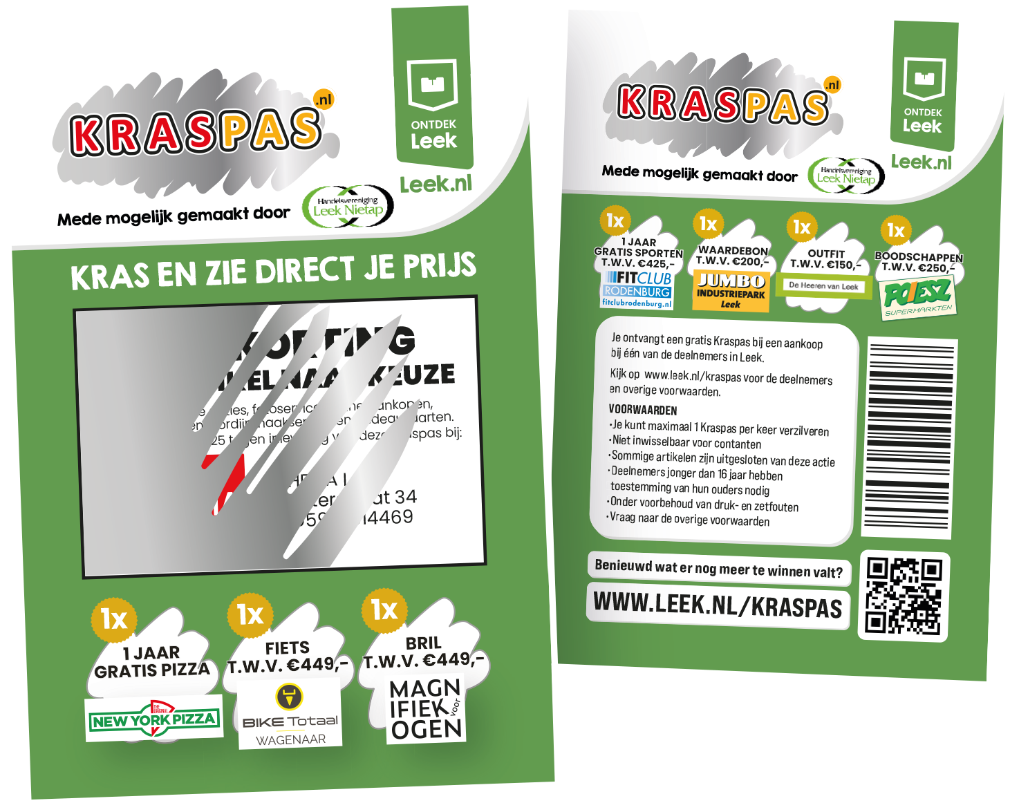 De kraspas is niet zomaar een leuk extraatje; onder de kraslaag schuilt een prijs. Of het nu gaat om hoofdprijzen, gratis artikelen of mooie kortingen en aanbiedingen bij winkels in Leek, er is voor iedereen iets bijzonders te winnen.