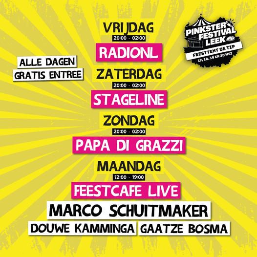 Wij hebben alle festivalactiviteiten voor je verzameld! Ontdek waar je moet zijn en welke DJ's, zangers of bands optreden tijdens het Pinksterweekend. Naast natuurlijk de kermis, de Pinkstermarkt, de zonnige terrassen en het winkelen in Leek.