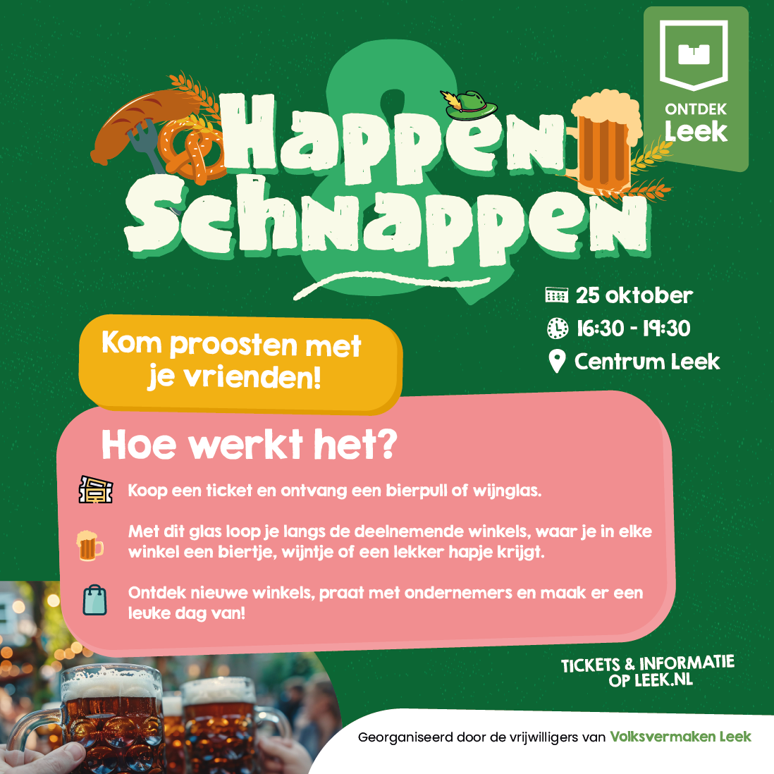 De vrijwilligers van Volksvermaken Leek nodigen je uit om op vrijdag 25 oktober deel te nemen aan Happen & Schnappen - de Oktoberfest Editie!