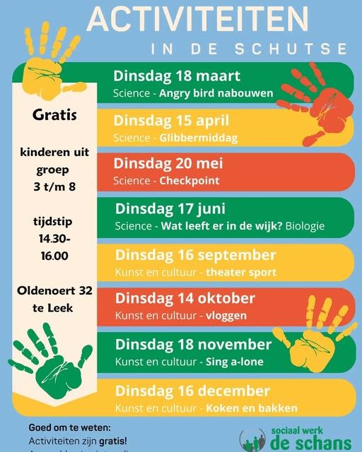 Sociaal Werk de Schans wil met deze activiteiten kinderen stimuleren om nieuwe dingen te ontdekken en hun talenten te ontwikkelen. Deelname is helemaal gratis!
