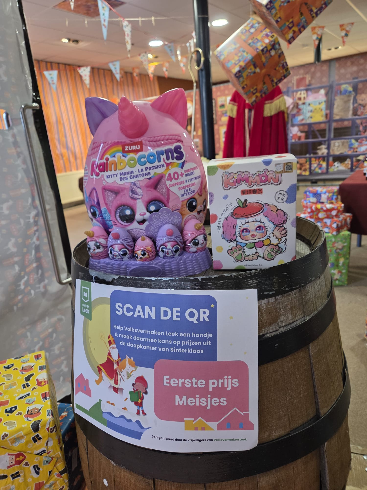 Dit jaar introduceert Volksvermaken Leek een nieuwe actie rondom de slaapkamer en pakjesfabriek van Sinterklaas in het centrum van Leek. Bezoekers kunnen bij de slaapkamer en op de speurkaart een QR-code scannen. Met deze QR-code kan iedereen een kleine, zelf gekozen bijdrage doen ter ondersteuning van de activiteiten die de vrijwilligers van Volksvermaken organiseren.