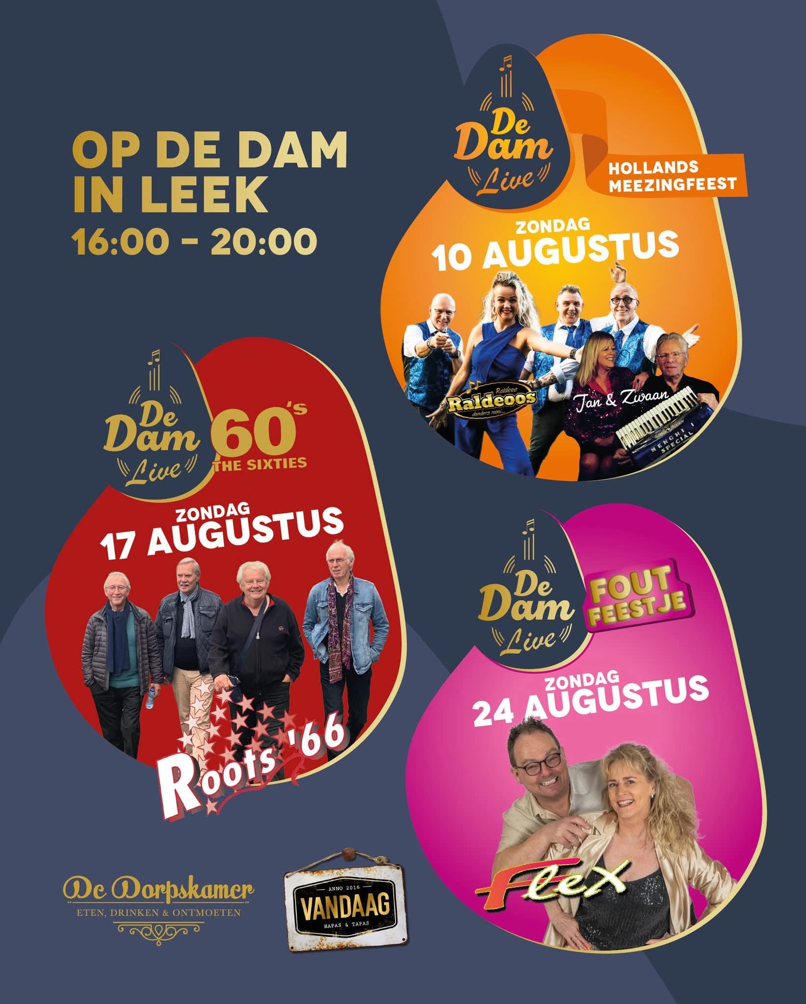 Deze zomer wordt het extra gezellig in het centrum van Leek. Tijdens De Dam Live organiseren De Dorpskamer en Vandaag Hapas & Tapas drie muzikale zondagmiddagen vol sfeer, muziek en ontmoeting. Van 16.00 tot 20.00 uur kun je op 10, 17 en 24 augustus terecht op De Dam voor een gratis feestje.