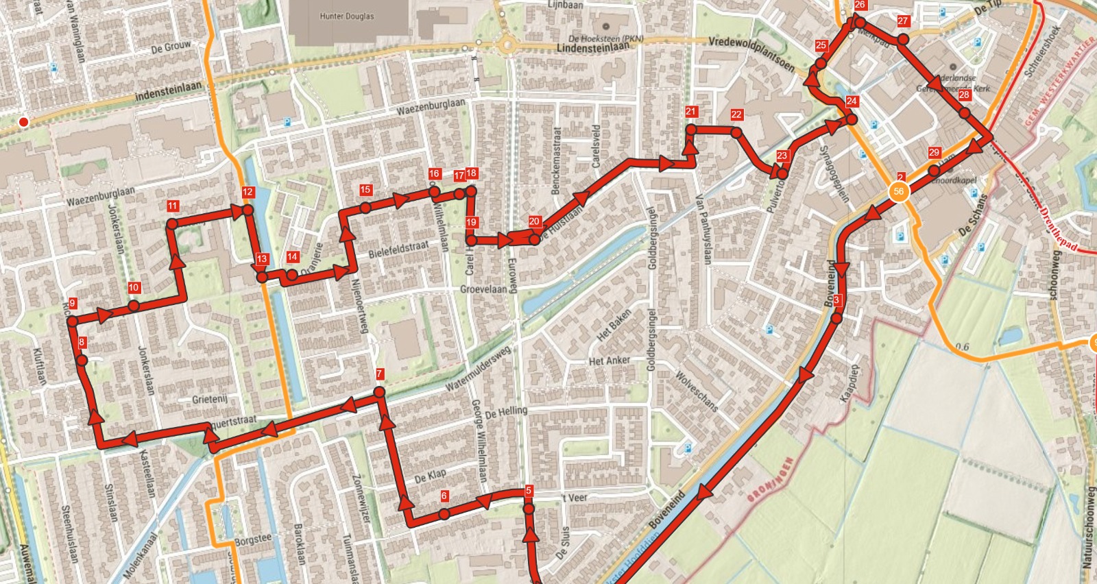 - Loop vanaf de start richting de Kerkweg en loop deze tot de driesprong naar de Euroweg (verkeersregelaars). Sla hier rechtsaf richting de Euroweg.